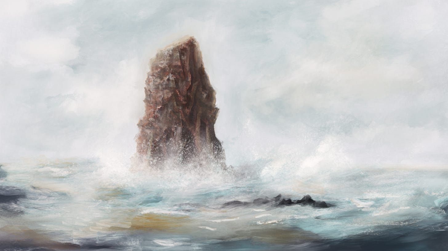 The rock against the sea was once only an image in a book. Now, afraid and exposed, she inhabits it with nothing between her and the sky but granite. Not a watery sea of spray and billow, but an inland sea of grass and silence with Jane at its center, holding fast.